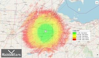 The map shows reception related to type of antenna.